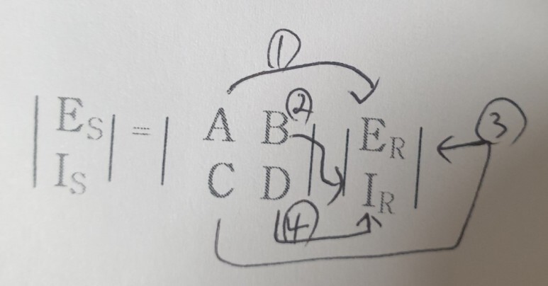 여기서 A,B,C,D는 회로의 구성요소에 의해 정해지는 4단자 정수이며 AD-BC=1 이라는 관계를 이용하여 이들 4단자 정수값을 검증할 수도 있다.